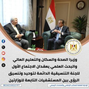 عقد الدكتور خالد عبد الغفار نائب رئيس مجلس الوزراء ووزير الصحة والسكان، والدكتور أيمن عاشور، وزير التعليم العالي والبحث العلمي، اجتماعا لتوحيد وتنسيق الرؤى بين المستشفيات التابعة للوزارتين، وخلال الاجتماع، أكد الدكتور أيمن عاشور، وزير التعليم العالي والبحث العلمي، على الجهود الكبيرة التي بذلها المجلس الأعلى للمستشفيات الجامعية بالتنسيق مع قطاعات وزارة الصحة خلال الفترة الماضية، مشيدًا بحجم التعاون المتميز الذي ساهم في تعزيز كفاءة المنظومة الصحية، وتوفير خدمات علاجية وصحية أفضل للمواطنين، وشدد الوزير على أهمية استمرار وتعزيز هذا التنسيق المشترك بين الوزارتين، تنفيذاً لتوجيهات القيادة السياسية، بما يضمن تعظيم الاستفادة من الكوادر الطبية المتميزة بالمستشفيات الجامعية.