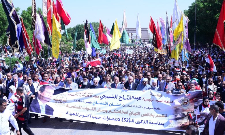 10 آلاف طالب وطالبة بجامعة سوهاج في مسيرة ضخمة احتفالًا بالذكري الـ52 لانتصارات أكتوبر