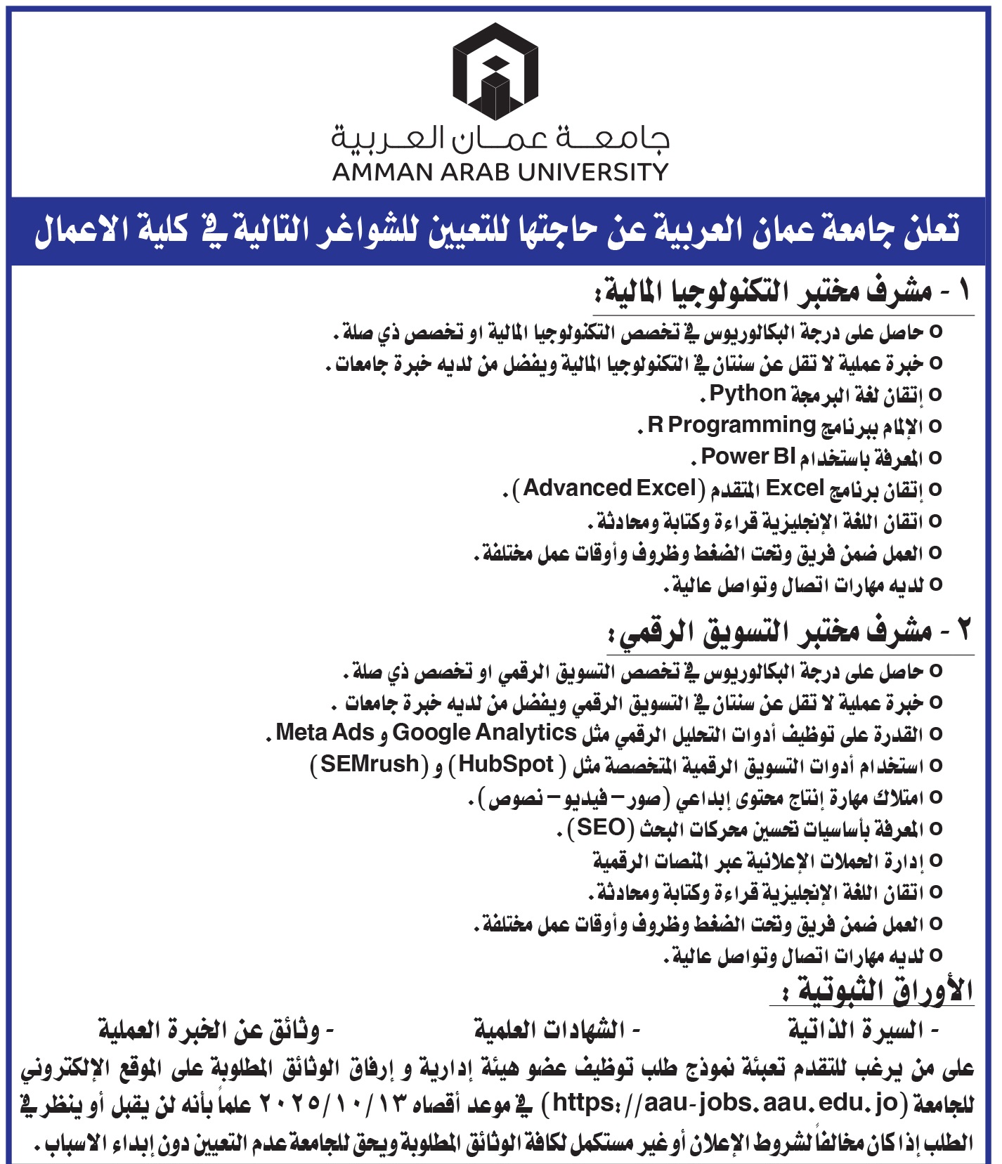 غلق باب التقدم 13 أكتوبر.. جامعة عمان العربية تعلن عن وظائف شاغرة جديدة