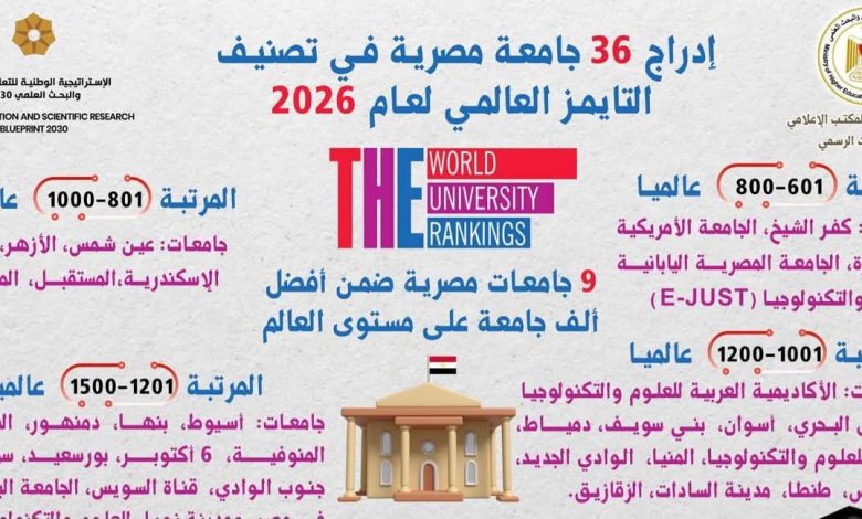 وأشار المتحدث الرسمي إلى أن الجامعات المصرية كانت قد تواجدت في تصنيف التايمز عام 2016 بنحو 3 جامعات فقط، ثم ارتفع العدد إلى 8 جامعات عام 2017، و19 جامعة عام 2019، و28 جامعة عام 2024، ثم 35 جامعة في 2025، وصولًا إلى 36 جامعة في نسخة عام 2026، وهو ما يُعد أكبر حضور للجامعات المصرية في هذا التصنيف منذ انضمامها إليه.
