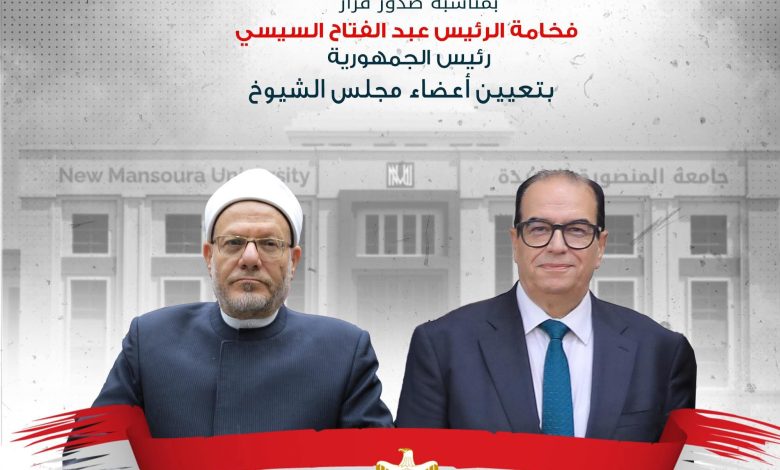 تقدم مجلس أمناء جامعة المنصورة الجديدة، بخالص التهاني وأطيب التمنيات إلى كلٍ من: الدكتور أحمد أحمد علي الشعراوي، نائب رئيس مجلس الأمناء ومحافظ الدقهلية الأسبق، والدكتور شوقي إبراهيم علام، مفتي جمهورية مصر العربية سابقًا.