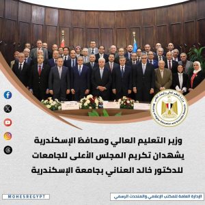 وشهد الدكتور أيمن عاشور وزير التعليم العالي والبحث العلمي، والفريق أحمد خالد محافظ الإسكندرية، تكريم المجلس الأعلى للجامعات للدكتور خالد العناني المرشح المُنتخب لمنصب مدير عام منظمة اليونسكو من قبل المجلس التنفيذي للمنظمة، وأكد الوزير أن هذا النجاح يعكس إيمان الدولة بأهمية العلم والاستثمار في الإنسان، وهو ما تسعى إليه الوزارة من خلال تمكين الشباب وتعزيز وعيهم الوطني، مشيرًا إلى أن تولي أحد أبناء مصر قيادة هذه المنظمة يمثل تقديرًا دوليًا للمكانة الحضارية والتاريخية لمصر، وإيمانًا بدورها الرائد في ترسيخ قيم السلام والحوار والتنوع الثقافي، فضلًا عن المساهمة في تعزيز حضور مصر في المؤسسات الدولية، وإضافة نصر جديد للثقافة والدبلوماسية المصرية.