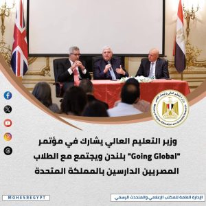 وعقد الدكتور أيمن عاشور، وزير التعليم العالي والبحث العلمي، سلسلة من اللقاءات الهامة، خلال زيارته للعاصمة البريطانية لندن، على هامش المشاركة المصرية الفاعلة في مؤتمر “Going Global” السنوي المعني بتدويل التعليم العالي، والتقى الوزير بعدد من الطلاب المصريين الدارسين في المملكة المتحدة، وأكد الوزير خلال اللقاء عمق العلاقات التاريخية بين مصر والمملكة المتحدة، مشيرًا إلى حرص الوزارة على تعزيز أطر التعاون الثنائي في مجالات التعليم العالي والبحث العلمي، كما استعرض رؤية الإستراتيجية الوطنية للتعليم العالي والبحث العلمي التي أُطلقت في مارس ٢٠٢٣، والمبنية على محاور رئيسية تشمل: (التكامل، والتخصصات البينية، والمشاركة، والاستدامة، والمرجعية الدولية، والاتصال، والابتكار وريادة الأعمال).