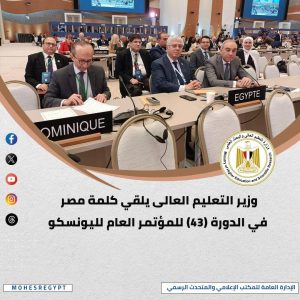 وألقى الدكتور أيمن عاشور وزير التعليم العالي والبحث العلمي، كلمة مصر أمام الدورة الثالثة والأربعين للمؤتمر العام لمنظمة الأمم المتحدة للتربية والعلم والثقافة (اليونسكو) في مدينة سمرقند بجمهورية أوزبكستان، وأكد الوزير أن التعاون بين مصر واليونسكو شهد خلال العامين الماضيين تطورات إيجابية، من أبرزها دعم المجلس التنفيذي لمبادرة التكيف والصمود في مجال المياه (AWARe) وإدماجها ضمن البرنامج الحكومي الدولي للمياه (IHP)، ومشاركة مصر في إحياء برنامج FRIEND-Nile، كما اعتمد المجلس قرار “بنك المعرفة المصري”، وزارت وفود دولية مصر في مايو 2024 للاطلاع على تجربته، إلى جانب توقيع اتفاقية بين مصر واليونسكو؛ لدعم التعاون الأكاديمي في الهندسة المعمارية والتخطيط الحضري، شملت إنشاء الأكاديمية الدولية لتعزيز الاستدامة البيئية ودعم جهود إعادة الإعمار في مناطق النزاعات بإفريقيا والشرق الأوسط.