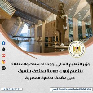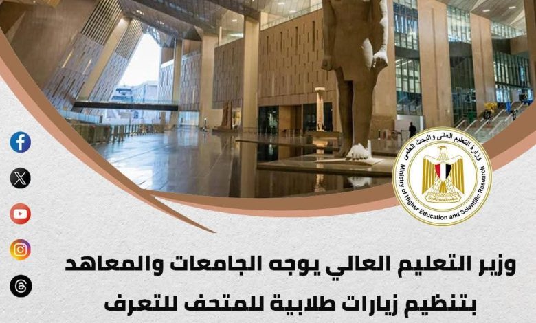 وأكد الدكتور أيمن عاشور وزير التعليم العالي والبحث العلمي، أن افتتاح المتحف المصري الكبير يعد حدثًا تاريخيًّا ومرحلة جديدة في سجل إنجازات الدولة المصرية المعاصرة، مشيرًا إلى أنه يمثل أحد أبرز المشروعات القومية والحضارية التي تبنتها الدولة بقيادة الرئيس عبد الفتاح السيسي، ليكون صرحًا عالميًّا تقدمه مصر هدية إلى الإنسانية جمعاء، ويجسد عظمة الحضارة المصرية الخالدة، ووجه الوزير الجامعات والمعاهد المصرية بتنظيم زيارات ميدانية للمتحف المصري الكبير عقب افتتاحه رسميًّا؛ بهدف تعريف الطلاب بعظمة حضارتهم العريقة، وربطهم بجذورهم الثقافية، وتنمية وعيهم بأهمية صون التراث المصري الذي يعد جزءًا أصيلا من الهوية الوطنية والإنسانية.
