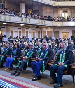 ومن جهته، قدم الدكتور أحمد رجب نائب رئيس جامعة القاهرة لشئون التعليم والطلاب، التهنئة للخريجين خلال حفل تخرجهم والذي يُعد يوم الحصاد ويمثل لحظة فارقة في حياة الطلاب، ويأتي تتويجًا لجهودهم على مدار سنوات من العمل الدؤوب، موجهًا الخريجين بضرورة الفخر للانتماء إلي كلية الاقتصاد والعلوم السياسية الصرح الدبلوماسي العريق، والانتماء لجامعة القاهرة المنارة العليمة الهامة على الخريطة العالمية والشرق الأوسط، ولانتمائهم إلى مصر القوية صاحبة الحضارة التي تمتد لآلاف السنين، كما وجه الشكر لأساتذة الكلية الذين لم يبخلوا بعلمهم وجهدهم على الطلاب، ولأولياء الأمور الذين ضحوا كثيرًا من أجل أن يستكمل أبناؤهم الدراسة الجامعية.