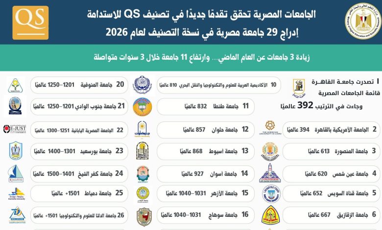 أعلن تصنيف QS العالمي للاستدامة نتائج نسخته الجديدة لعام 2026، والتي كشفت عن زيادة في تمثيل الجامعات المصرية داخل التصنيف؛ حيث تم إدراج 29 جامعة مصرية في نسخة هذا العام، لتحقق ارتفاعًا متواصلًا بعد أن كانت 18 جامعة فقط في نسخة 2024، ثم 26 جامعة في نسخة 2025، مع الحفاظ على جميع الجامعات التي ظهرت سابقًا دون خروج أي جامعة، وانضمام ثلاث جامعات لأول مرة، وهي: جامعة سوهاج، والجامعة البريطانية في مصر، وجامعة النيل.