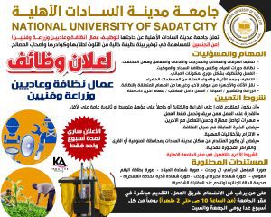 أعلنت جامعة مدينة السادات الأهلية، عبر موقعها الرسمي، عن حاجتها لتوظيف عمال (نظافة وعاديين وزراعة وفنيين) (من الجنسين) وأفراد أمن، للمساهمة في توفير بيئة نظيفة خالية من التلوث لطلابها وكوادرها وأصحاب المصالح للقيام بعدة مهام ومسئوليات.