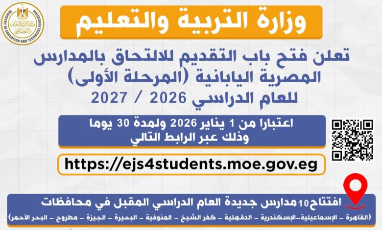 كما تعلن وزارة التربية التعليم فتح باب التقديم للطلاب في جميع المدارس المصرية اليابانية بمختلف محافظات الجمهورية، للعام الدراسي 2026-2027، وذلك بداية من غد الخميس الموافق 1 يناير 2026 ولمدة شهر، وذلك من خلال الرابط التالي: