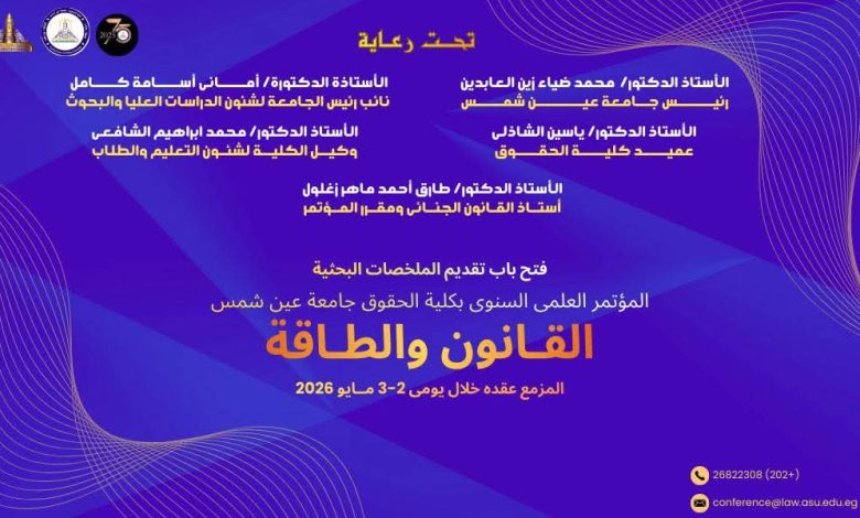 تحت شعار «القانون والطاقة».. حقوق عين شمس تعلن فتح باب تقديم الملخصات البحثية لمؤتمرها العلمي السنوي لعام 2026