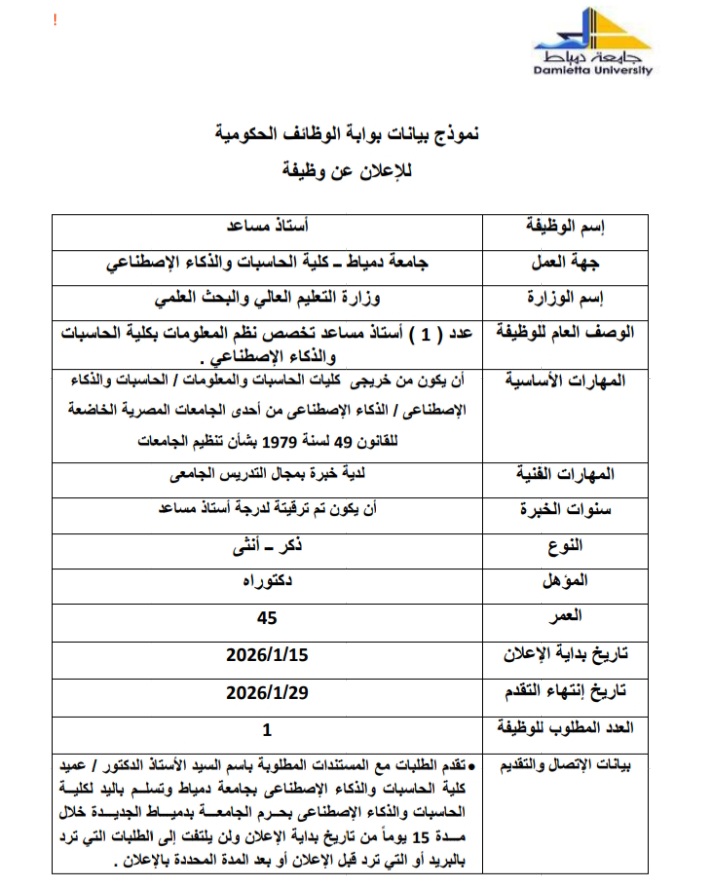 أعلنت جامعة دمياط، عبر بوابة الوظائف الحكومية، عن حاجتها لشغل عدد من الوظائف الشاغرة لأعضاء هيئة التدريس في كليتي الحاسبات والذكاء الإصطناعى والطب البشري في مختلف التخصصات.