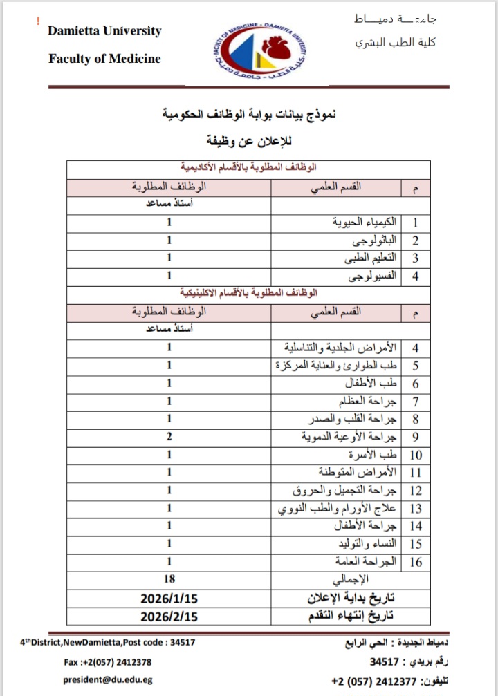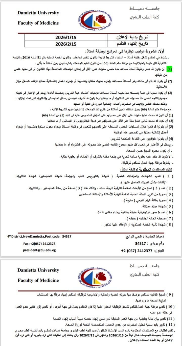 تقدم الطلبات مع المستندات المطلوبة باسم السيد الأستاذ الدكتور/عميد كلية الطب البشرى بجامعة دمياط وتسلم باليد لكلية الطب بحرم الجامعة بدمياط الجديدة خلال تبدأ من 15/1/2026 وتنتهي في 15/2/2026، ولن يلتفت إلى الطلبات التي ترد بالبريد أو التي ترد قبل الإعلان أو بعد المدة المحددة بالإعلان.