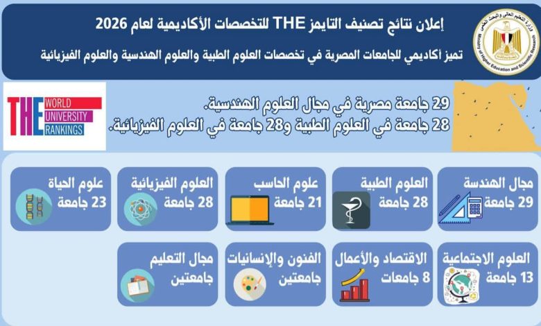 Times Higher Education World University Rankings by Subject (THE) نتائجه لعام 2026، والتي أبرزت تميز الجامعات المصرية في معظم التخصصات الأكاديمية التي شملها التصنيف، فضلًا عن تحقيق زيادة في أعداد الجامعات المُدرجة في العديد من التخصصات مقارنة بنتائج التصنيف للعام الماضي 2025.