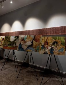 يجمع المعرض عدة لوحات فنية تجمع موضوعاتها ما بين الفن والتراث الذى يعبر عن الأصالة والحداثة فى آن واحد.