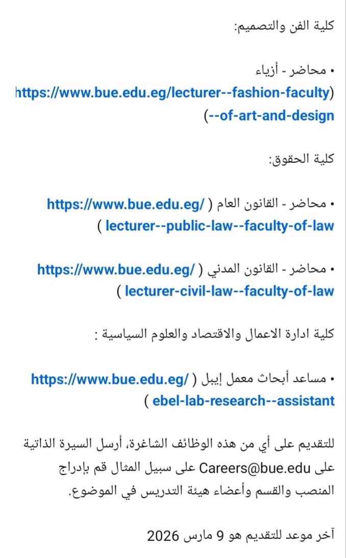 للتفاصيل: https://www.bue.edu.eg/job-vacancies