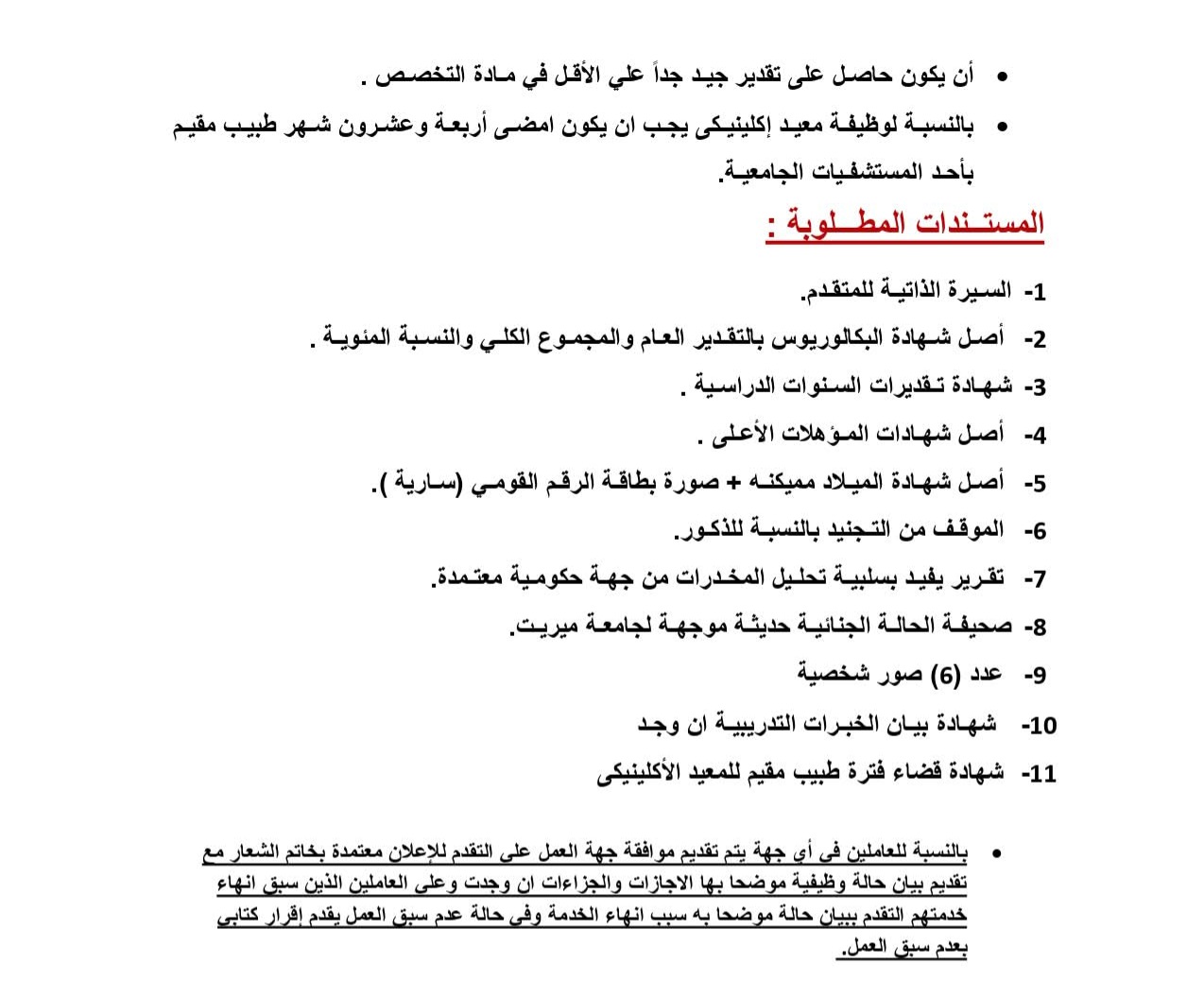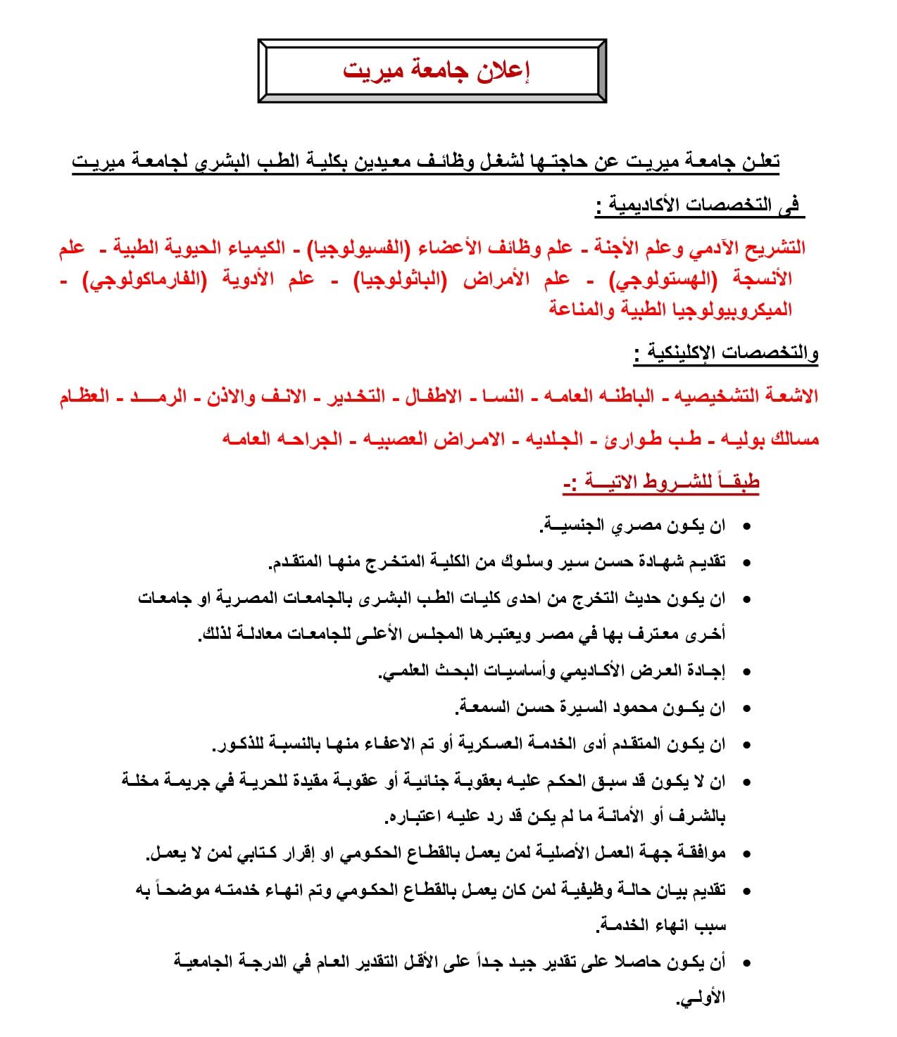 وذكرت جامعة ميريت: تقدم الطلبات باليد باسم السيد الأستاذ الدكتور / عميد الكلية مرفقا بالمستندات الموضحة فى موعد اقصاه 15 يوم من تاريخ الإعلان مع إحضار صور من كافة المستندات المطلوبة مع إحضار أصول المستندات للاطلاع.