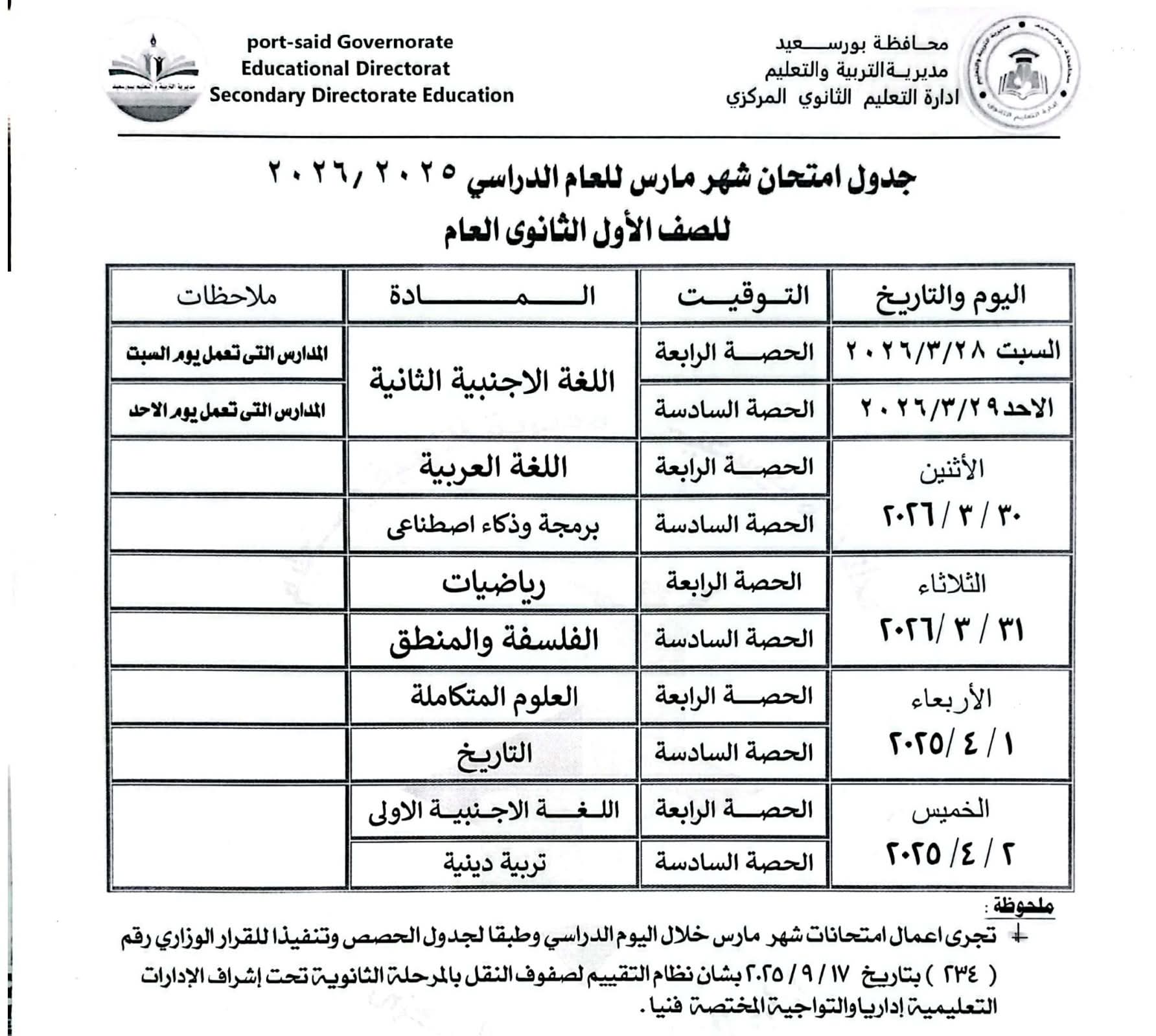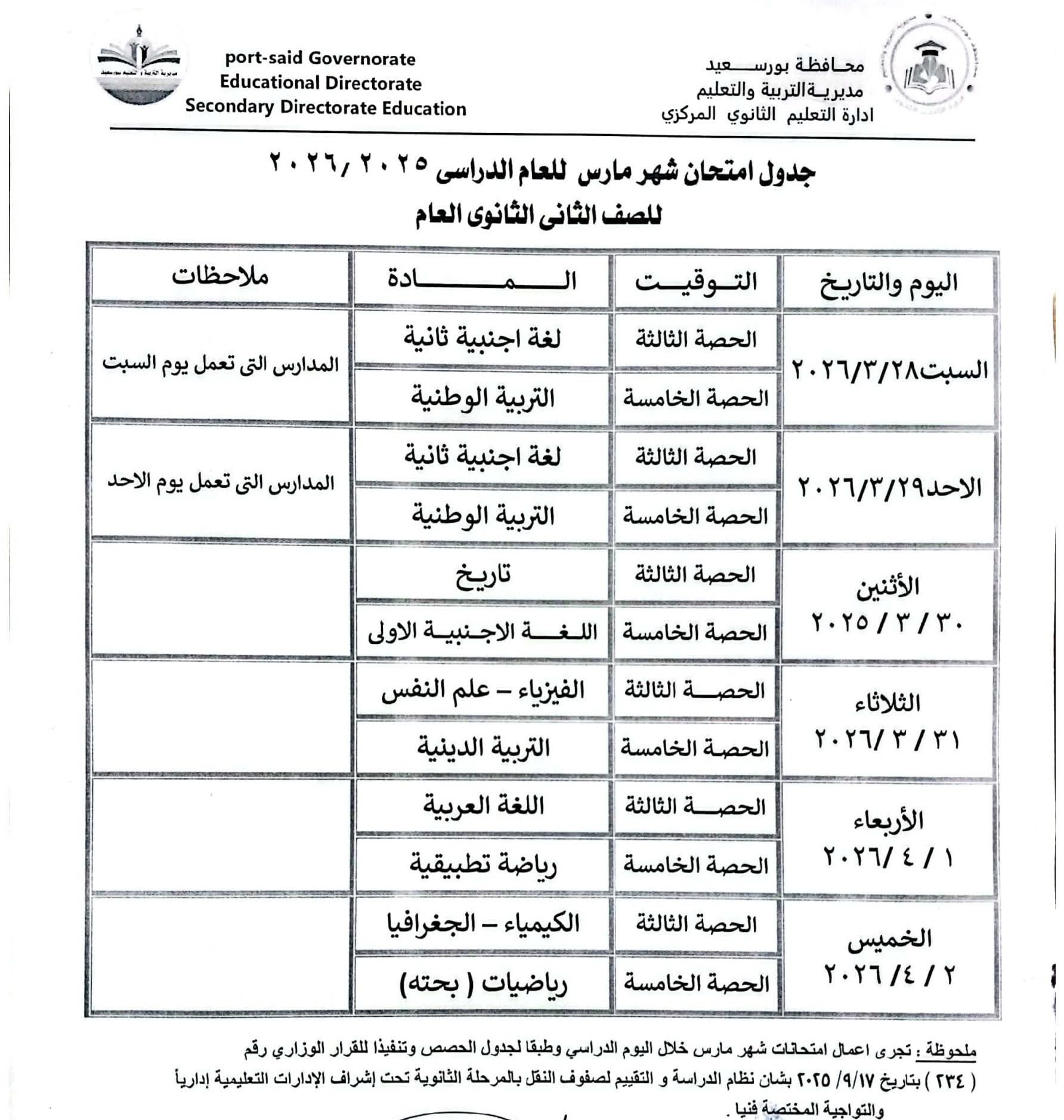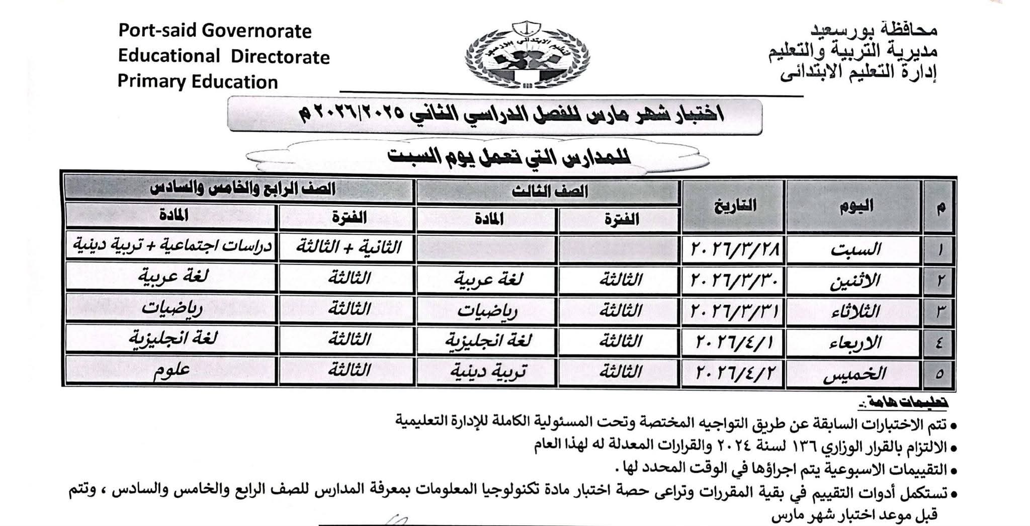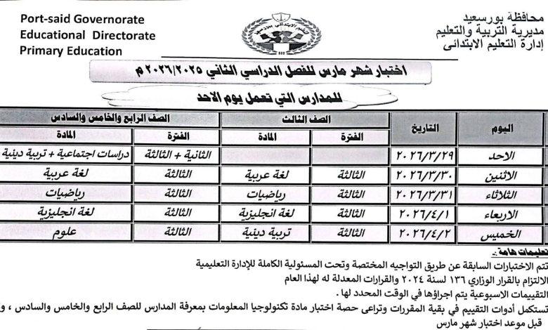 أعلنت مديرية التربية والتعليم بمحافظة بورسعيد، جداول اختبارات شهر مارس للفصل الدراسي الثاني.