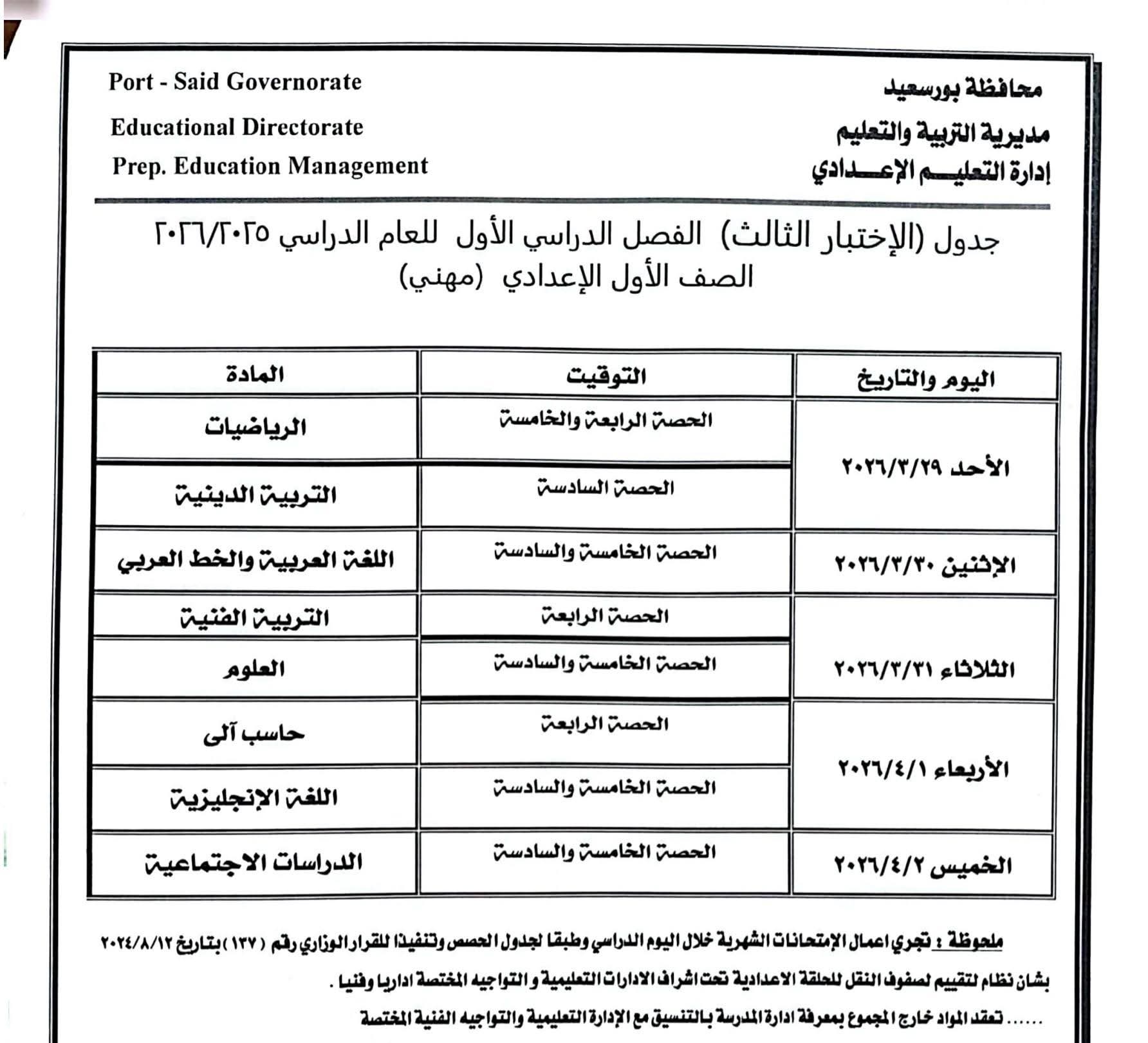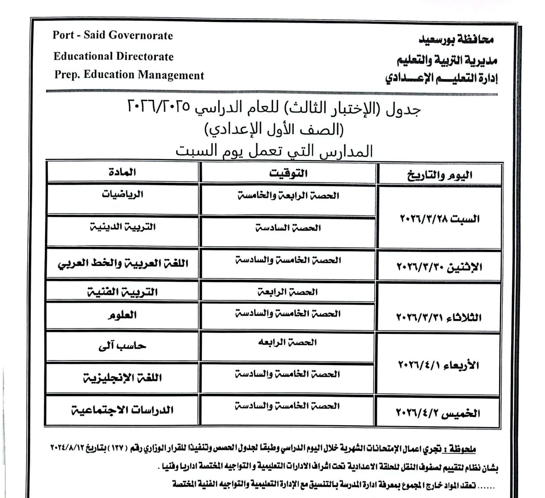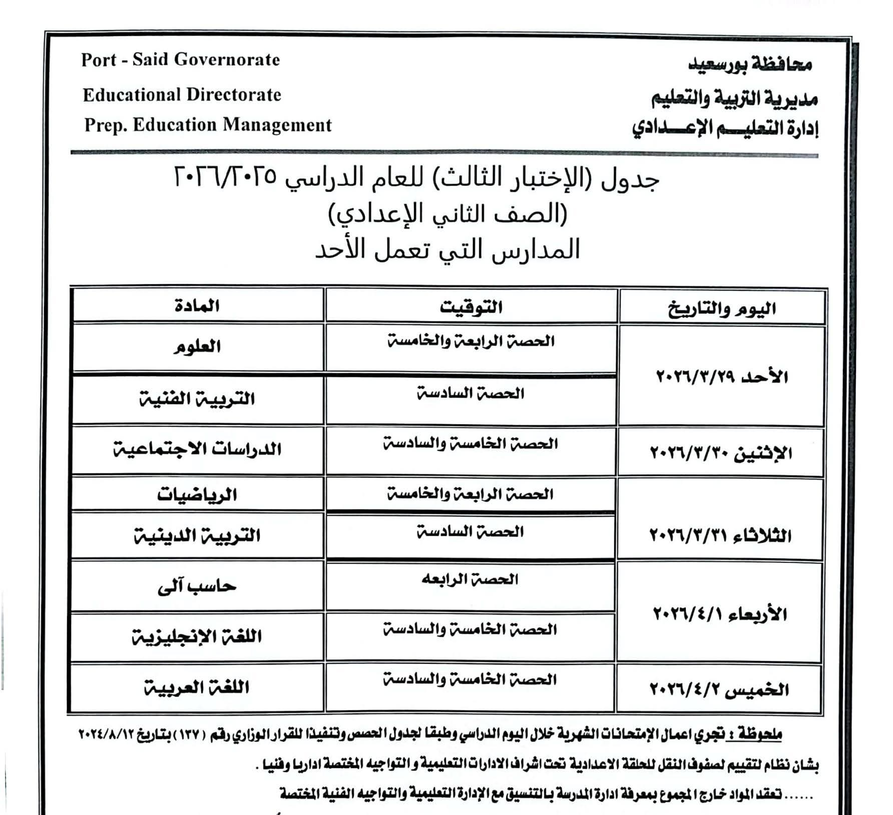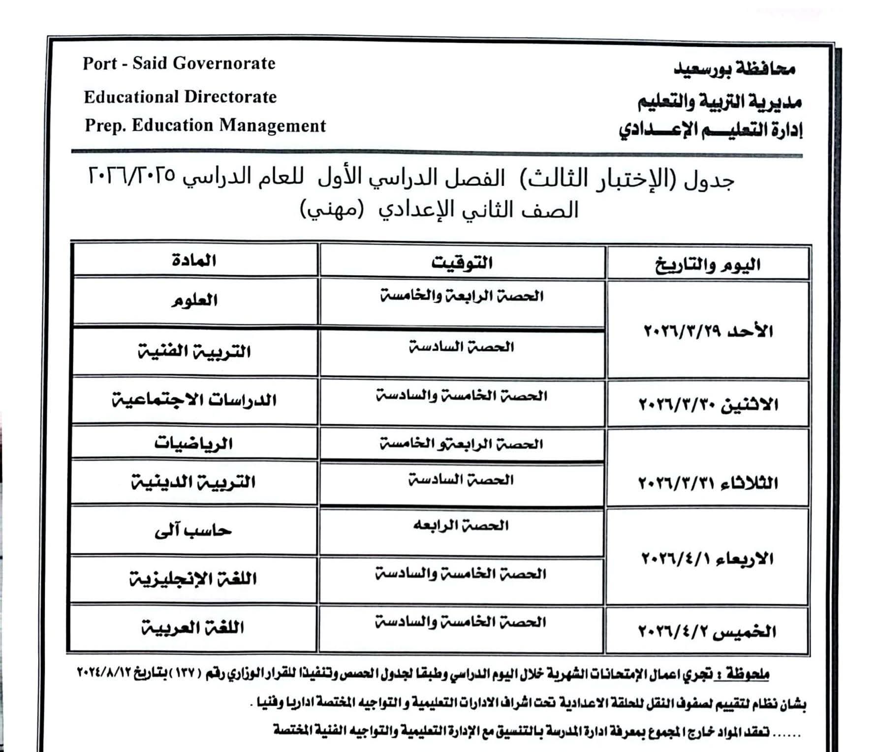أعلنت مديرية التربية والتعليم بمحافظة بورسعيد، جداول اختبارات شهر مارس للفصل الدراسي الثاني.