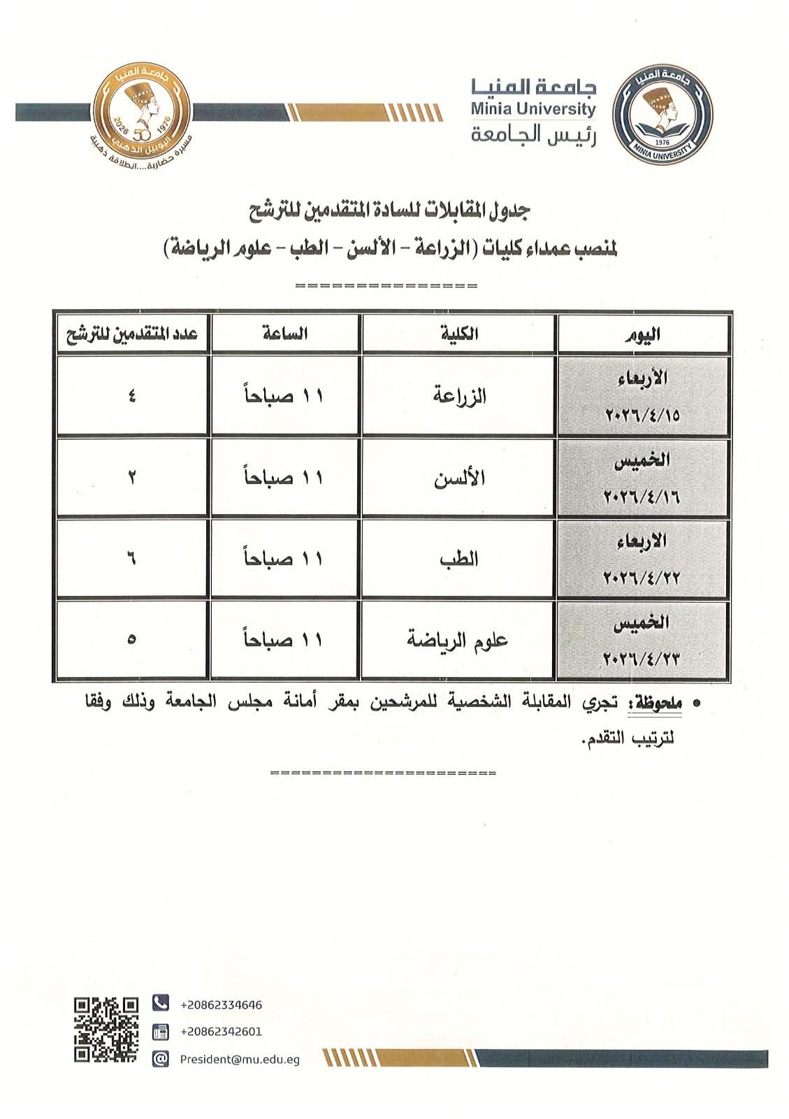 أعلنت جامعة المنيا جدول المقابلات للمتقدمين للترشح لمنصب عمداء كليات: (الزراعة – الألسن – الطب – علوم الرياضة).
