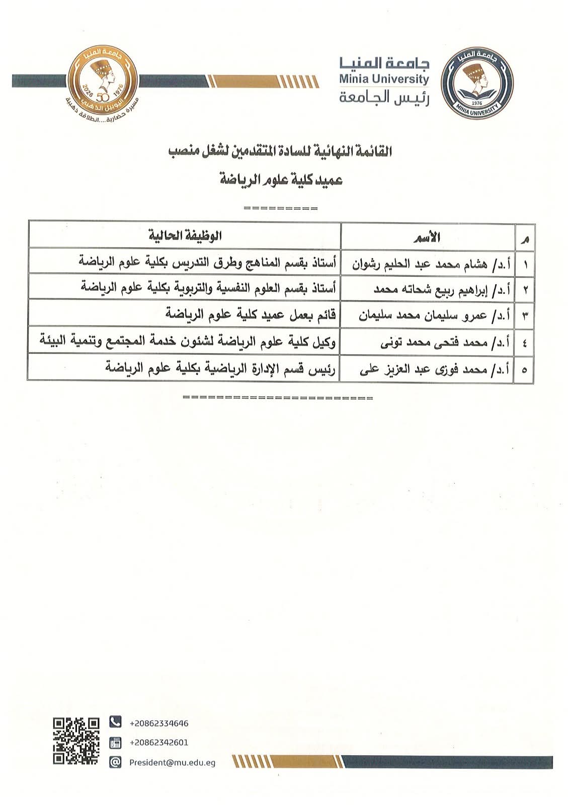 القائمة النهائية للمتقدمين لشغل منصب عميد كلية علوم الرياضة