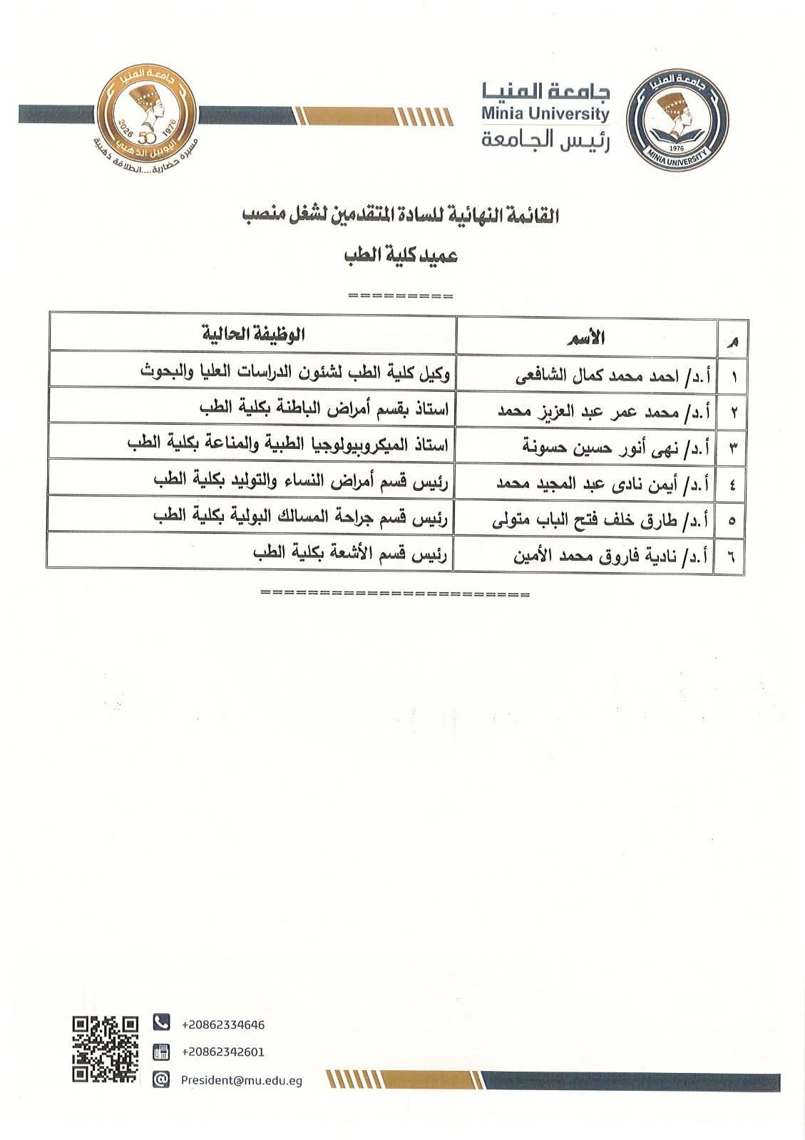القائمة النهائية للمتقدمين لشغل منصب عميد كلية الطب