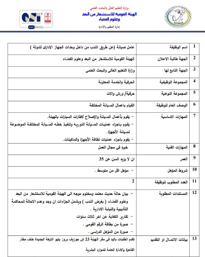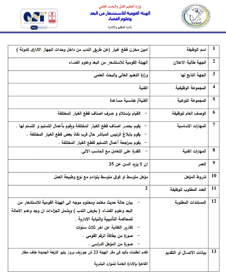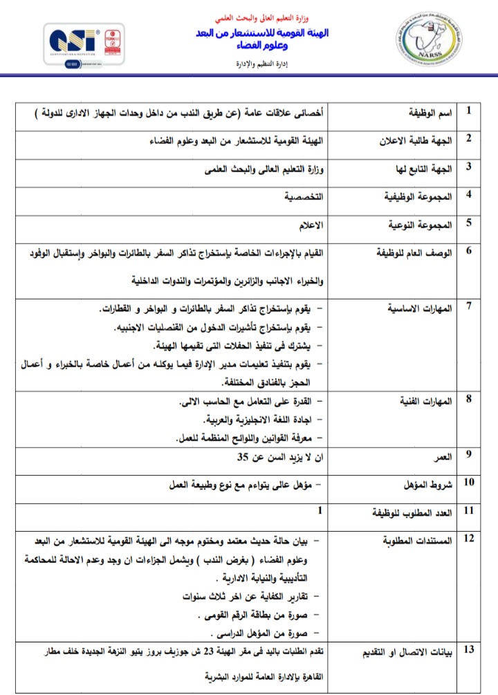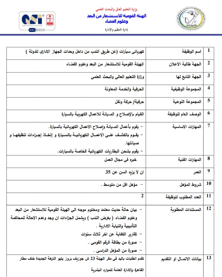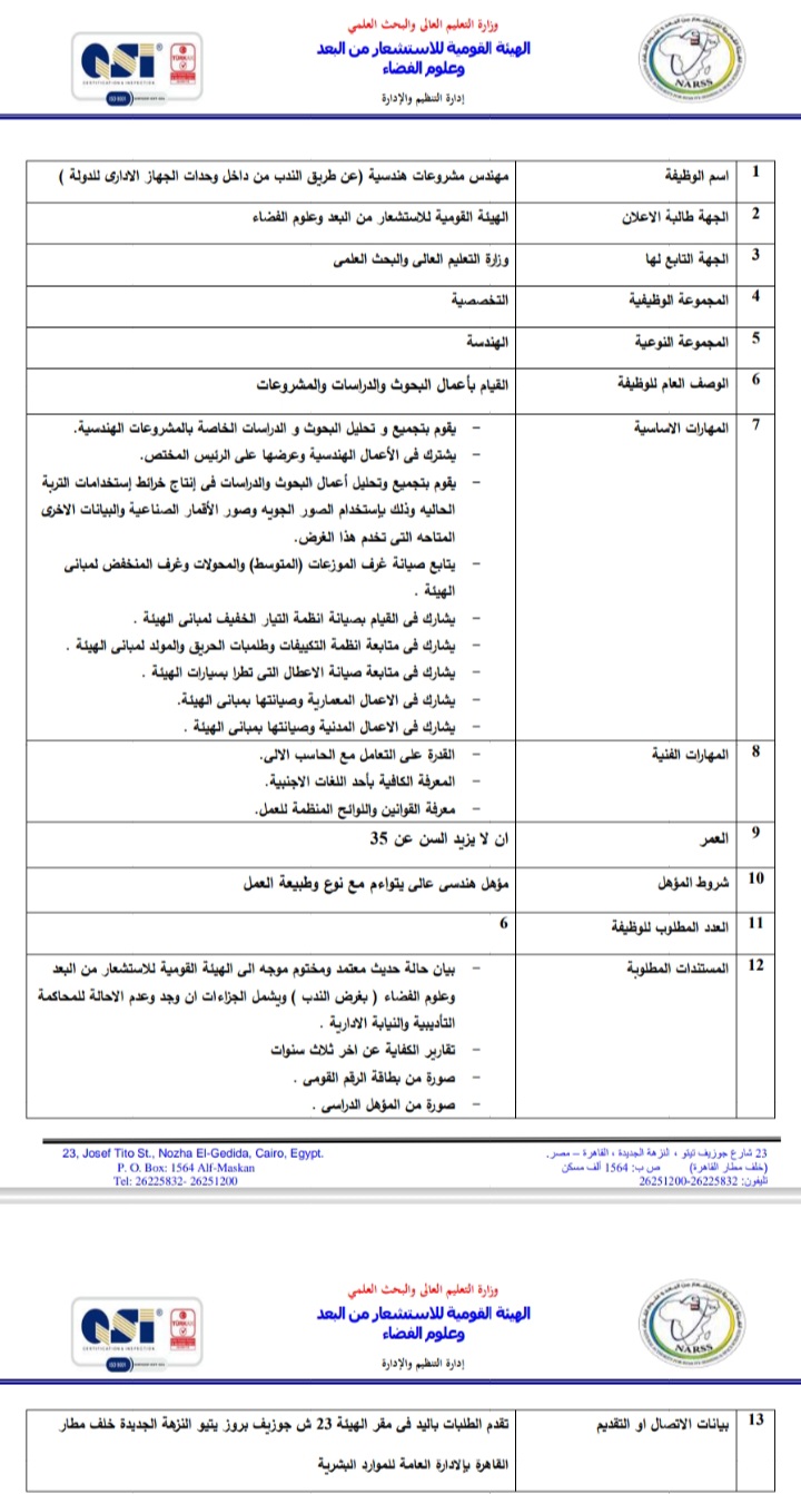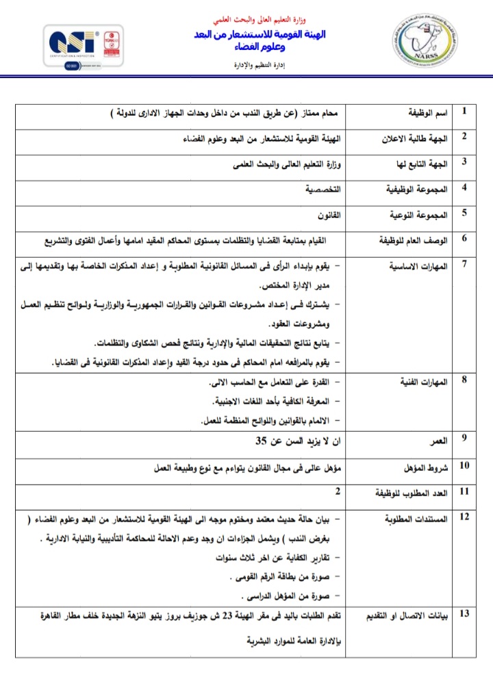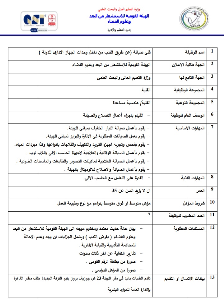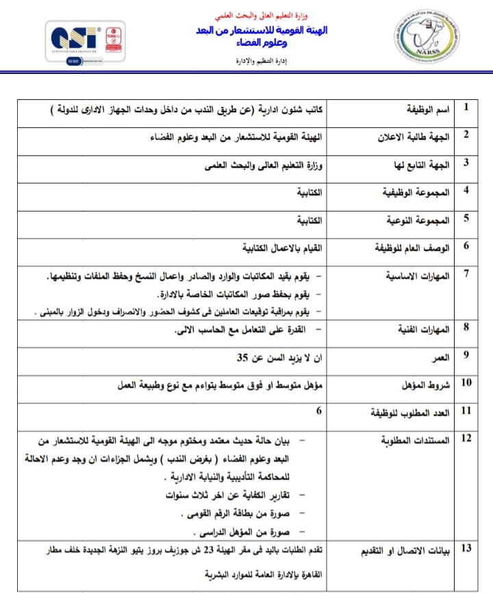 أعلنت الهيئة العامة للاستشعار عن بعد وعلوم الفضاء التابعة لوزارة التعليم العالي والبحث العلمي، عبر بوابة الوظائف الحكومية،عن حاجتها لشغل وظائف عن طريق الندب، علي أن يتم غلق باب التقدم في 23 أبريل المقبل.