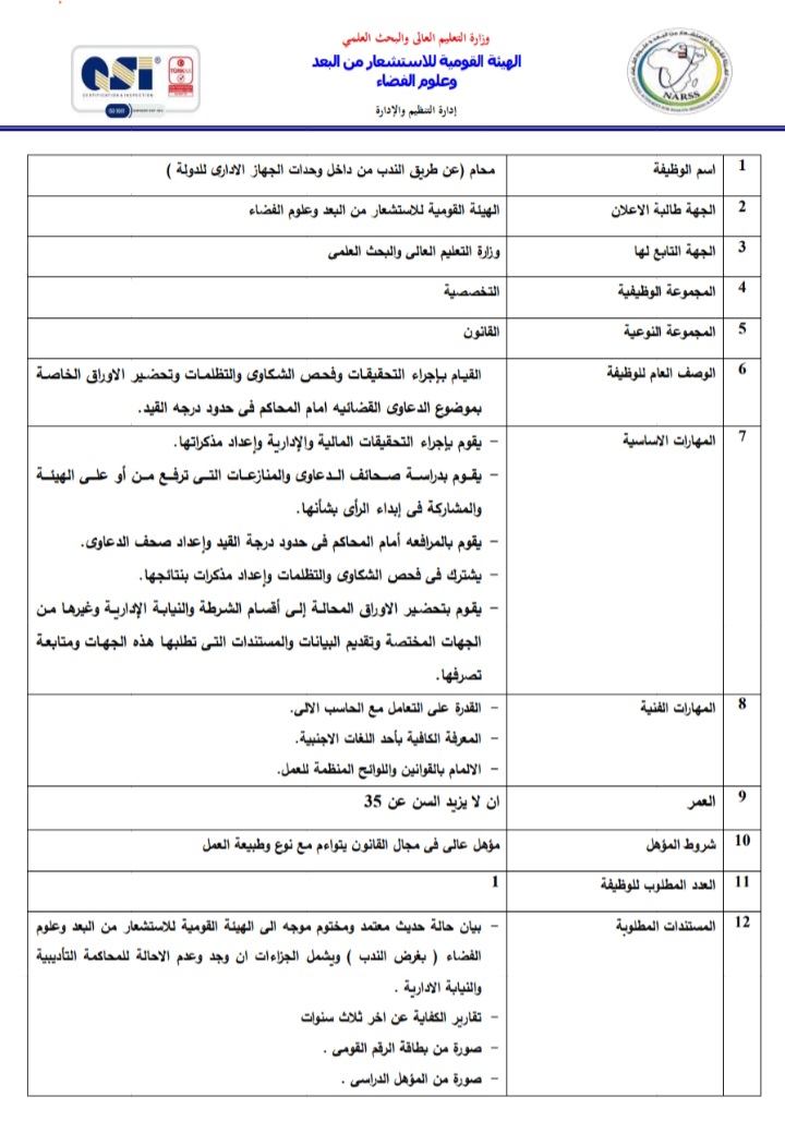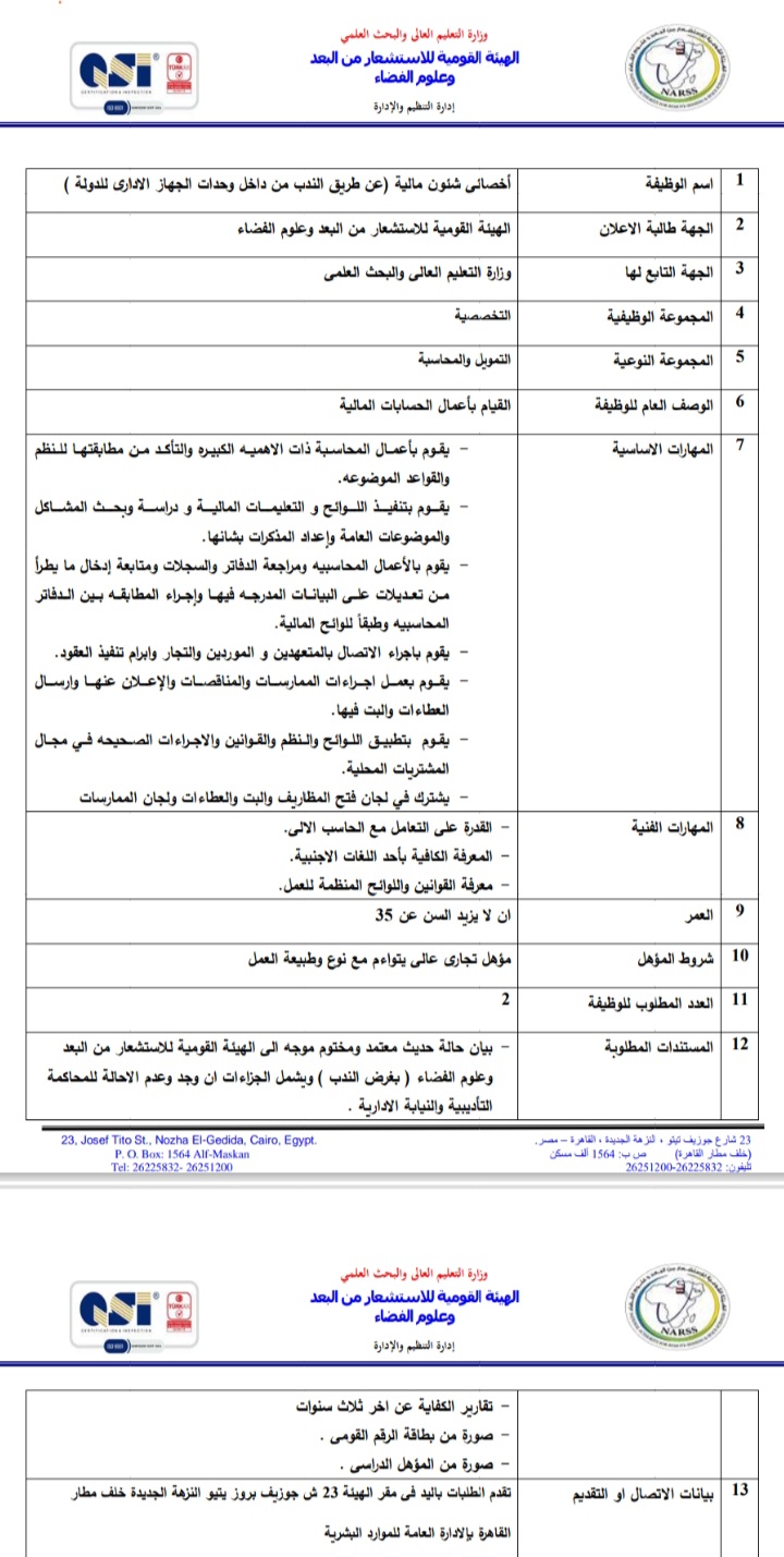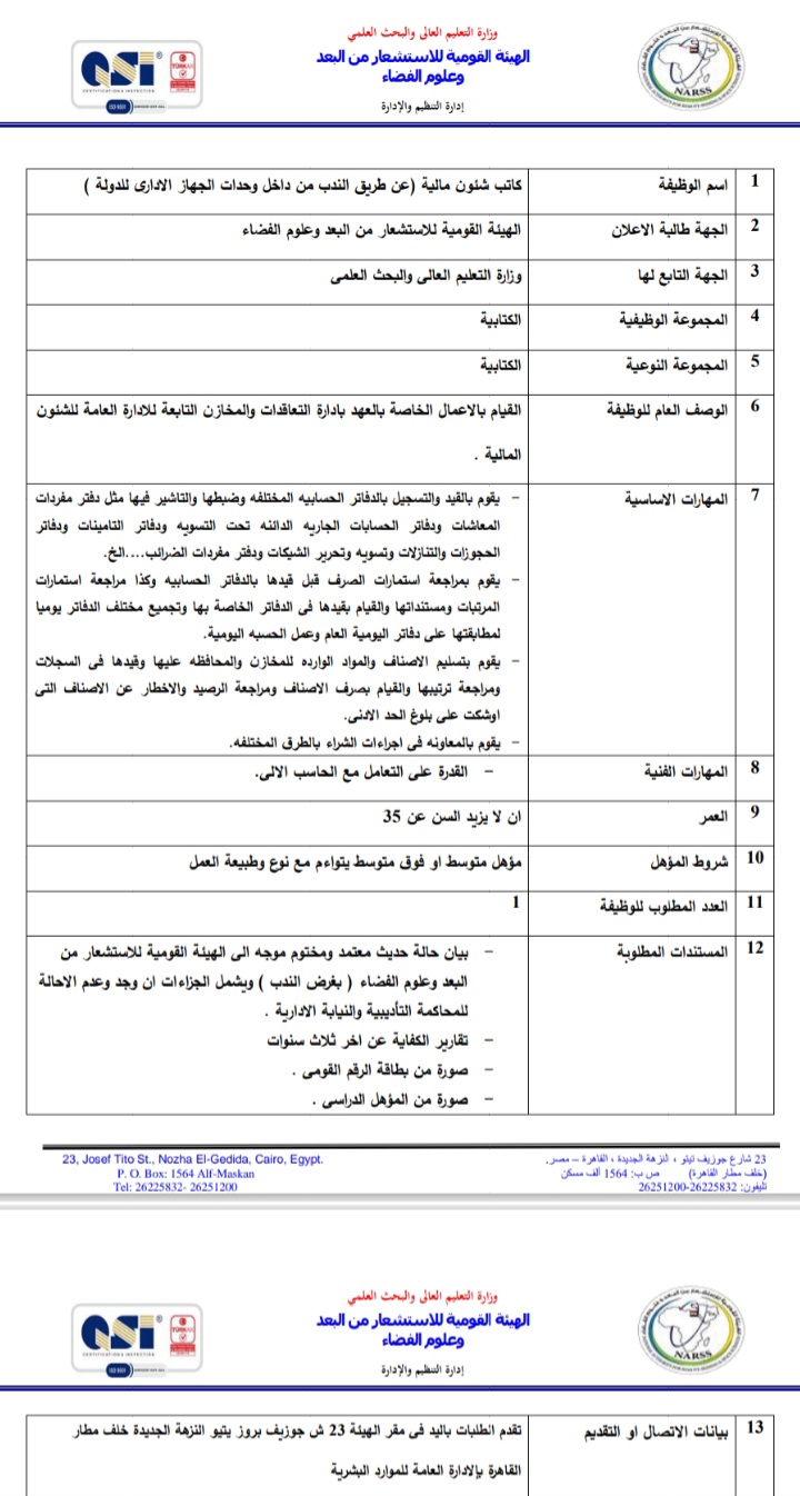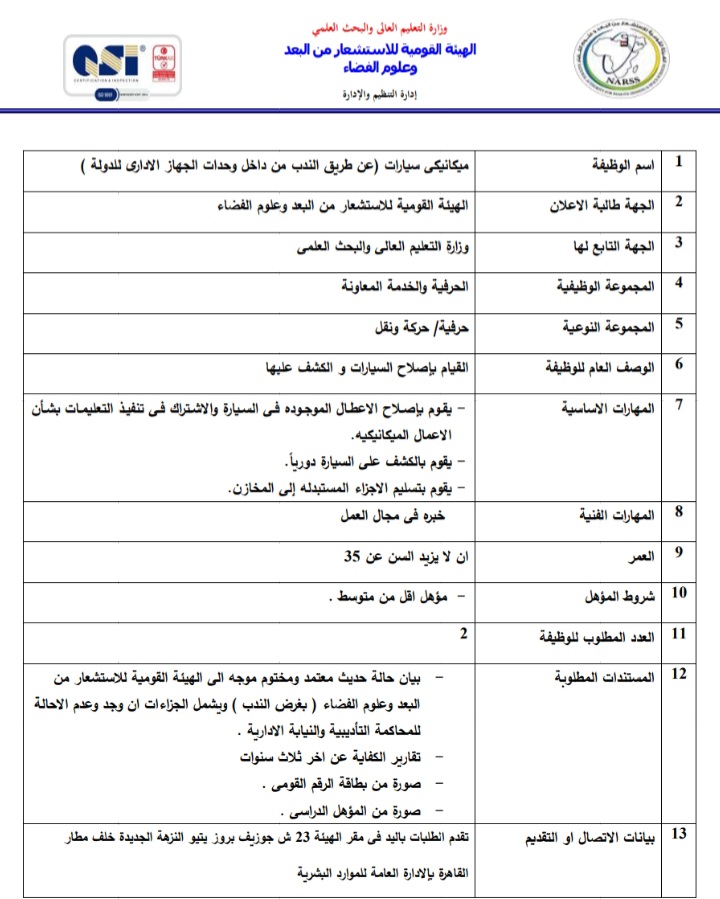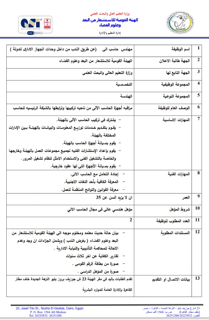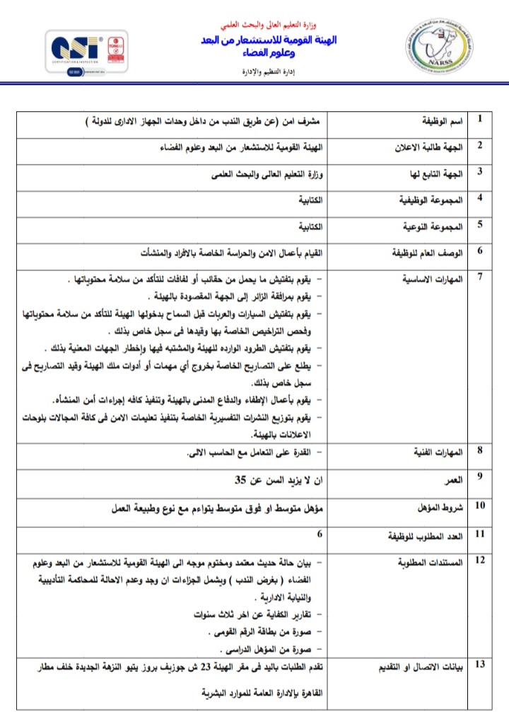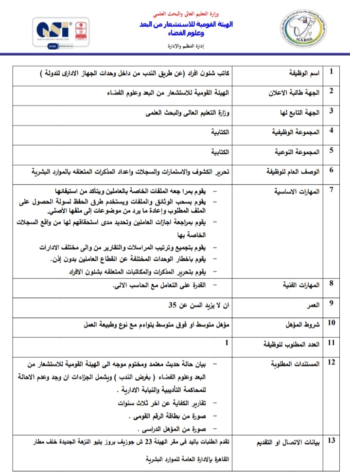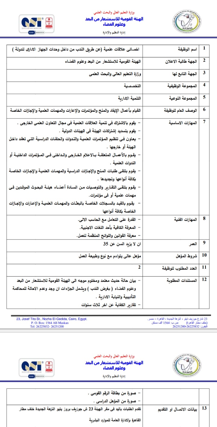 أعلنت الهيئة العامة للاستشعار عن بعد وعلوم الفضاء التابعة لوزارة التعليم العالي والبحث العلمي، عبر بوابة الوظائف الحكومية،عن حاجتها لشغل وظائف عن طريق الندب، علي أن يتم غلق باب التقدم في 23 أبريل المقبل.