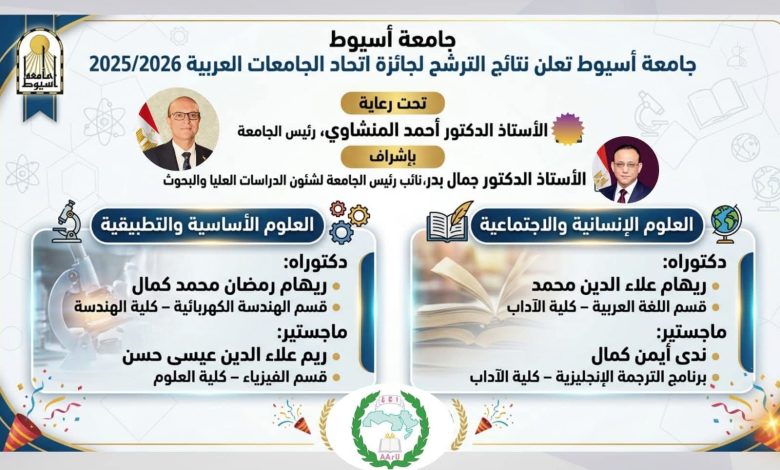 جامعة أسيوط تعلن نتائج الترشح لجائزة أفضل رسائل الماجستير والدكتوراه لاتحاد الجامعات العربية 2025-2026