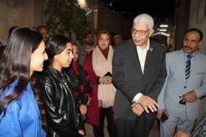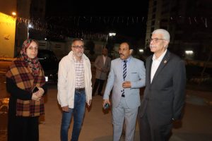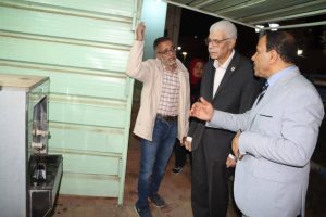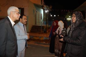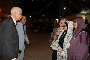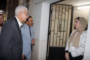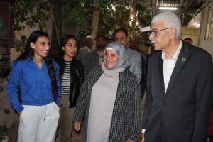 رافقه الدكتور صبحى شرف نائب رئيس الجامعة لشئون خدمة المجتمع وتنمية البيئة والمشرف على قطاع شؤون التعليم والطلاب، وكان فى استقباله المهندسة سهيلة إبراهيم مدير عام المدن الجامعية، ومديرى المدن وأخصائى التغذية والإسكان بمدينة العلوم بالقرب من مجمع الكليات النظرية، ومدينة الطالبات الجديدة والقديمة بالبر الشرقى.