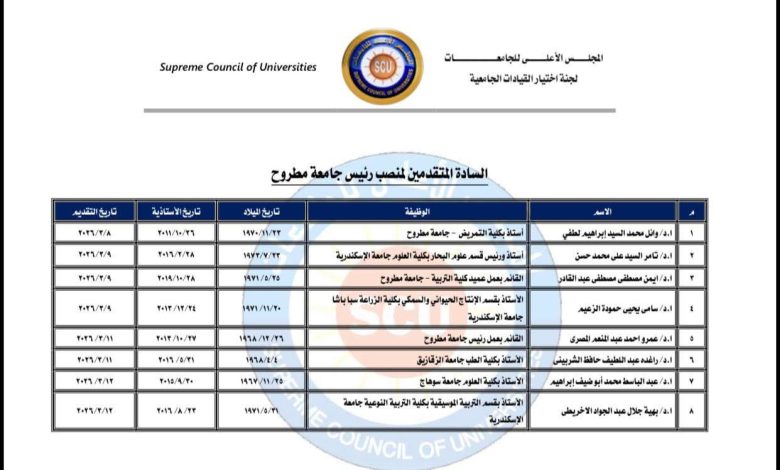 قررت لجنة اختيار القيادات الجامعية عقد المقابلات للمتقدمين لشغل منصب رئيس جامعة مطروح، يوم السبت الموافق 4 أبريل 2026، في تمام الساعة العاشرة صباحًا، وذلك بمقر أمانة المجلس الأعلى للجامعات، ووفقًا للقائمة النهائية