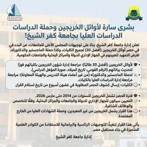 أعلنت الصفحة الرسمية لكلية التربية بجامعة كفر الشيخ، في الفيسبوك، “إعلان هام لخريجي كلية التربية”، أنه في ضوء توجيهات أمانة المجلس الأعلى للجامعات، يُرجى التكرم بالاطلاع على التعليمات التالية: