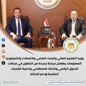 عقد الدكتور عبد العزيز قنصوة، وزير التعليم العالي والبحث العلمي، والمهندس رأفت هندي، وزير الاتصالات وتكنولوجيا المعلومات، اجتماعًا موسعًا بمقر وزارة التعليم العالي بالعاصمة الجديدة، وتناول اللقاء استعراض محاور العمل المشتركة والمقترحة لتطوير المنظومة التعليمية والبحثية باستخدام التقنيات الحديثة من خلال ٤ محاور وهى بناء القدرات والذكاء الاصطناعى والتحول الرقمى ودعم الابتكار وريادة الأعمال، وخلال اللقاء، بحث الوزيران، التوسع فى برامج التدريب من خلال دمج البرامج التدريبية التقنية ضمن المناهج الجامعية، استنادًا إلى تجربة التعاون الناجحة مع جامعة القاهرة في ريادة الأعمال مع ربط التدريب باحتياجات سوق العمل.