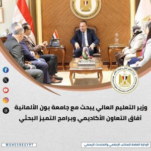 عقد الدكتور عبدالعزيز قنصوة، وزير التعليم العالي والبحث العلمي، اجتماعًا مع البروفيسور مايكل هوخ، رئيس جامعة بون الألمانية ورئيس المؤسسة الألمانية للمنح الأكاديمية، وشهد اللقاء مناقشات موسعة حول تطوير برامج تعليمية مشتركة ومزدوجة، وتعزيز التعاون البحثي في المجالات ذات الأولوية، إلى جانب دعم برامج التبادل الطلابي وأعضاء هيئة التدريس، وربط مخرجات البحث العلمي بالصناعة، وتبادل الخبرات في مجالات دعم الابتكار واستقطاب المواهب، واختُتم الاجتماع بالاتفاق على إعداد خطة عمل مشتركة خلال الفترة المقبلة، تتضمن تحديد المجالات والأولويات البحثية، ودراسة آليات تطبيق نماذج التميز البحثي الدولية، وتفعيل مشروعات بحثية مشتركة، بما يسهم في تعميق التعاون العلمي ودعم جهود بناء اقتصاد المعرفة في مصر.