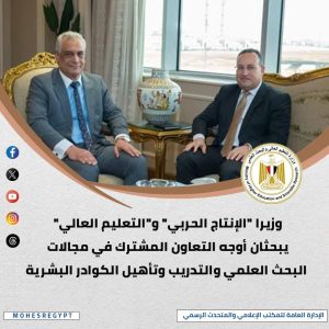 استقبل الدكتور مهندس صلاح سليمان جمبلاط وزير الدولة للإنتاج الحربي، الدكتور عبدالعزيز قنصوة وزير التعليم العالي والبحث العلمي، لبحث موضوعات التعاون المشترك، وأكد الدكتور عبد العزيز قنصوة وزير التعليم العالي والبحث العلمي على أهمية هذا اللقاء الذي يستهدف متابعة مستجدات عدد من المشروعات المشتركة التي تنفذها الشركات والوحدات التابعة لوزارة الإنتاج الحربي، موضحًا أن هذا التعاون ينطلق من إيمان الجانبين بأهمية ربط البحث العلمي بالصناعة وتحويله إلى منتجات وخدمات مبتكرة، بما يدعم تطوير الصناعة المصرية ويعزز الاقتصاد القومي ويسهم في إعداد كوادر قادرة على قيادة التنمية القائمة على المعرفة والتكنولوجيا والابتكار.