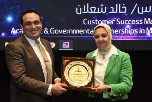 وقامت الدكتورة أماني أسامة كامل بتكريم كلٍ من الدكتور محمد أمير والمهندس خالد شعلان، بإهدائهما درع الجامعة، تقديرًا لجهودهما.
