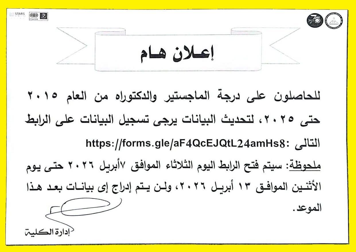 وذكرت الكلية: لتحديث البيانات، يرجى تسجيل البيانات على الرابط التالى: