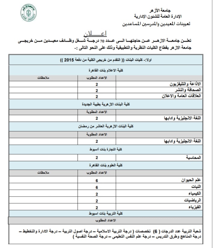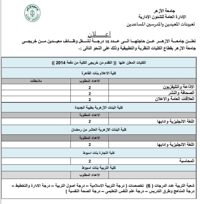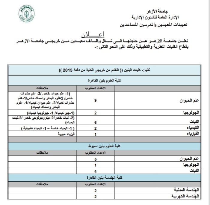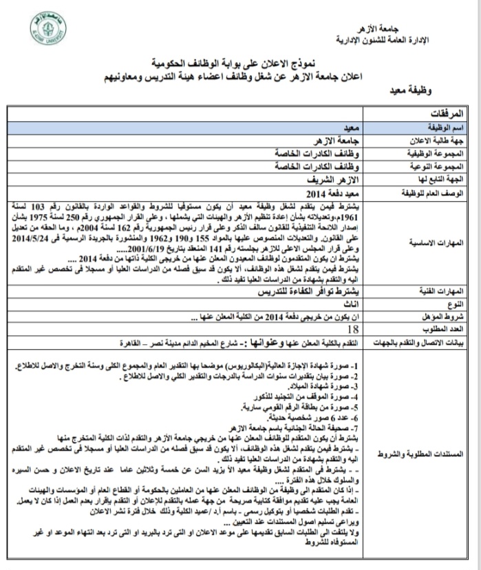 – يشترط أن يكون المتقدم للوظائف المعلن عنها من خريجي جامعة الأزهر والتقدم لذات الكلية المتخرج منها.
