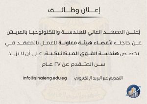 أعلن المعهد العالي للهندسة والتكنولوجيا بالعريش، عن حاجته لأعضاء هيئة معاونة للعمل بالمعهد في تخصص هندسة القوى الميكانيكية، على أن لا يزيد سن المتقدم عن ٢٧ سنة.