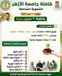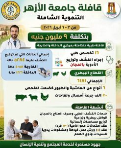 وأشار نائب رئيس جامعة الأزهر إلى أن أطباء القافلة قاموا بإجراء عدد 32 عملية جراحية كبرى، و94 عملية صغرى، مع إجراء التحاليل الطبية اللازمة للحالات التي تطلبت ذلك، مشيرًا إلى أن القافلة ضمت أساتذة في كليات الزراعة والهندسة، وتم إهداء عدد 3080 شجرة مثمرة، وتم تحصين ولقاح عدد 6181 للماشية “عجول – أبقار – أغنام – دواجن – أرانب – حمام – بط”.