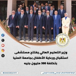 افتتح الدكتور عبدالعزيز قنصوة وزير التعليم العالي والبحث العلمي، مستشفى استقبال ورعاية الأطفال بجامعة المنيا، بتكلفة تقريبية تقدر بـ 300 مليون جنيه؛ بهدف دعم خدمات الطوارئ والرعايات الحرجة للأطفال، وتقديم خدمة طبية متكاملة وفق أحدث المعايير، وأكد الدكتور عبدالعزيز قنصوة، أن الوزارة تواصل جهودها لتعزيز جودة الخدمات الصحية والتعليم الطبي، وتطوير منظومة المستشفيات الجامعية، بما يسهم في تحسين مستوى الرعاية الصحية المقدمة للمواطنين، مع دعم التعليم الطبي والبحث العلمي، من خلال تطوير أداء شباب الكوادر الطبية والتمريض، وذلك من خلال تقديم برامج تدريبية وتعليمية متقدمة، وربط التعليم بالممارسات العملية والمعايير الدولية.