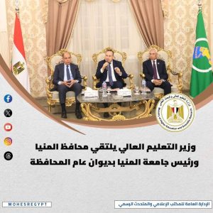 التقى الدكتور عبد العزيز قنصوة وزير التعليم العالي والبحث العلمي، اللواء عماد كدواني محافظ المنيا، والدكتور عصام فرحات رئيس جامعة المنيا، وجاء اللقاء على هامش زيارة الدكتور عبد العزيز قنصوة لمحافظة المنيا لافتتاح وتفقد العديد من المنشآت الجامعية والصحية والخدمية بجامعة المنيا، وأوضح الدكتور عبد العزيز قنصوة أن الوزارة تستهدف الارتقاء بجودة مخرجات منظومة التعليم العالي، ودعم تقدم الجامعات في التصنيفات الدولية المرموقة، مشيرًا إلى الاهتمام بمنح درجات علمية مزدوجة بالتعاون مع كبرى الجامعات الدولية المتميزة، لصقل خبراتهم وتنمية مهاراتهم، وتقديم تجربة تعليمية متميزة، وتشجيعهم على الابتكار والإبداع.