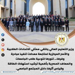 عقد الدكتور عبدالعزيز قنصوة، وزير التعليم العالي والبحث العلمي، اجتماعًا مع ممثلي الاتحادات الطلابية بالجامعات الحكومية والأهلية والخاصة والتكنولوجية، والأسر المركزية، وممثلي إدارات رعاية الطلاب؛ وخلال الاجتماع وجه الوزير بتحويل مبادرات ممثلي الاتحادات الطلابية والأسر المركزية إلى تكليفات تنفيذية تطبق على أرض الواقع، وأن تخضع للمتابعة والتقييم وقياس الأثر، وكلف معهد إعداد القادة بتقديم تقارير دورية مفصلة عن سير تنفيذ هذه المبادرات ومواجهة أي صعوبات تواجهها.