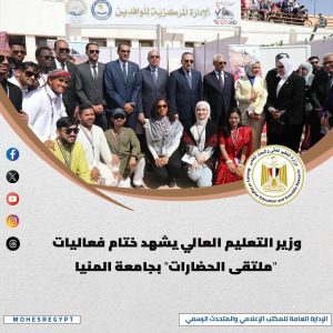 شهد الدكتور عبدالعزيز قنصوة وزير التعليم العالي والبحث العلمي، ختام فعاليات “ملتقى الحضارات على أرض الحضارات.. عروس الصعيد”، الذي نظمته جامعة المنيا، وأكد الدكتور عبدالعزيز قنصوة أهمية مشاركة الطلاب في مختلف الأنشطة والفعاليات التي تنظمها الجامعات، وذلك في إطار إستراتيجية متكاملة تهدف إلى تعزيز مكانة الجامعات المصرية كمقصد تعليمي جاذب للطلاب الوافدين، من خلال ربط العملية التعليمية بالتجربة الثقافية والسياحية، بما يسهم في زيادة أعداد الطلاب الوافدين، ودعم موارد الدولة من العملة الأجنبية.