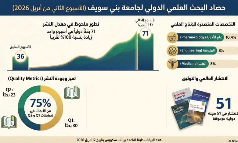 وأوضح رئيس جامعة بني سويف أنه خلال الفترة من 5 إلى 11 أبريل الجارى، تمكن الباحثين بالجامعة من نشر 71 بحثًا دوليًا في 51 مجلة علمية مرموقة مدرجة بقاعدة بيانات سكوبس العالمية، وهو رقم قياسي يعكس تنامي الإنتاج البحثي وتزايد تأثيره عالميًا، مشيرا إلى تنوع مجالات النشر بين العلوم الدوائية والهندسة والطب والكيمياء وعلوم المواد والفيزياء والزراعة وعلوم الحاسب، مما يبرز تميز الكوادر البحثية وتنوع تخصصاتها.