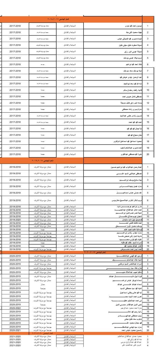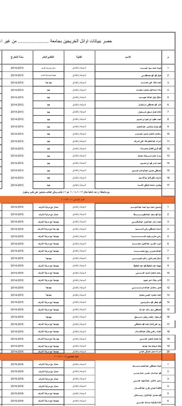 أعلنت كلية السياحة والفنادق بجامعة الفيوم، أنه في إطار حرص الكلية على تحديث قواعد البيانات، تم الانتهاء من إعداد حصر ببيانات أوائل الخريجين خلال السنوات العشر الماضية، وذلك بالكشف المرفق.