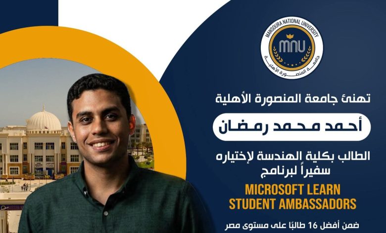 أعلنت جامعة المنصورة الأهلية عن اختيار الطالب المهندس أحمد محمد رمضان أبو المعاطي، ببرنامج هندسة الذكاء الاصطناعي، سفيرًا لشركة مايكروسوفت ضمن برنامج Microsoft Learn Student Ambassadors، حيث تم اختياره ضمن 16 طالبًا فقط على مستوى مصر.