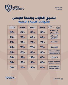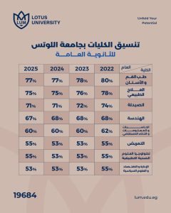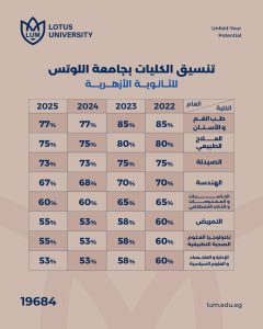 كما أعلنت جامعة اللوتس عن الحد الأدنى للقبول بمختلف الكليات وفقًا لقواعد التنسيق المعتمدة (التفاصيل بالصورة).