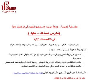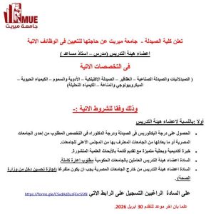كما أعلنت جامعة ميريت ميريت عن حاجتها لشغل وظائف أعضاء هيئة تدريس بدرجة مدرس وأستاذ مساعد في 7 تخصصات.