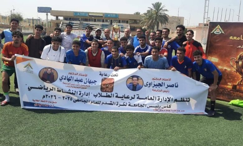 أعلنت الدكتورة جيهان عبد الهادي نائب رئيس الجامعة لشئون الدراسات العليا والبحوث، فوز كلية علوم الرياضة ببطولة كأس رئيس الجامعة بعد فوزها على كلية الآداب فى المباراه النهائية ٣ / صفر.
