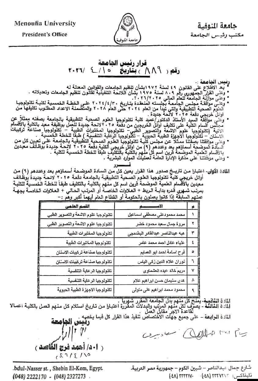 تعيين 9 معيدين جدد أوائل دفعة 2025 بكلية تكنولوجيا العلوم الصحية التطبيقية بالمنوفية